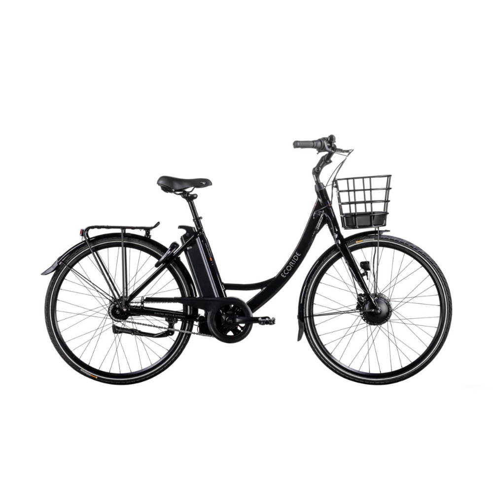 En tradionell damcykel på el. Här får du fotbroms, pakethållare och korg. Insteget är lågt och cykeln ger en behagligt upprätt sittställning.